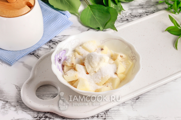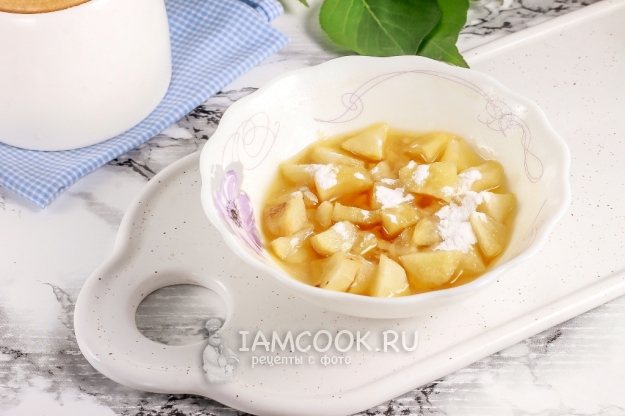 Яблоко или яблоки, если они мелкие, промойте и очистите от кожуры. Вырежьте семенные блоки и нарежьте кубиками, ломтиками в пиалу или креманку. Помните, что емкость должна быть без серебристых или золотистых рисунков. Добавьте 30 г сливочного масла и присыпьте нарезку молотой корицей.