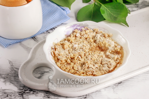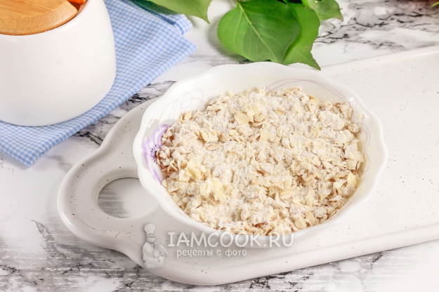 Перемешайте в отдельной емкости сахар, соль, пшеничную муку, овсяные хлопья быстрого приготовления и оставшееся сливочное масло. Выложите сверху на томленые яблоки в креманке и разровняйте поверхность.