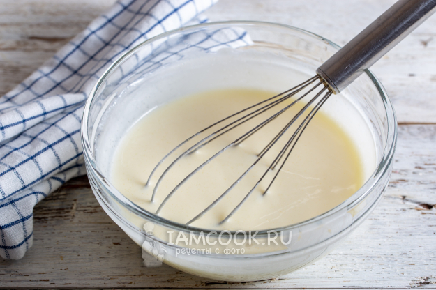 Для сметанной заливки в глубокой посуде смешайте сметану, яйцо, сахар и ванилин. Перемешайте до соединения ингредиентов.