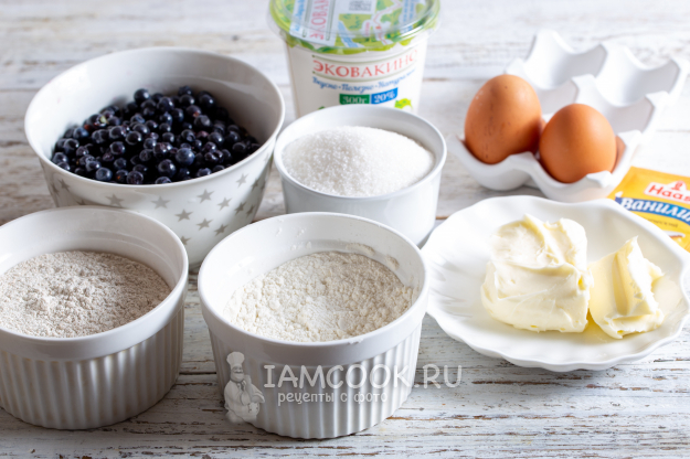 Подготовьте указанные ингредиенты для финского черничного пирога со сметанной заливкой. Сливочное масло предварительно достаньте их холодильника.