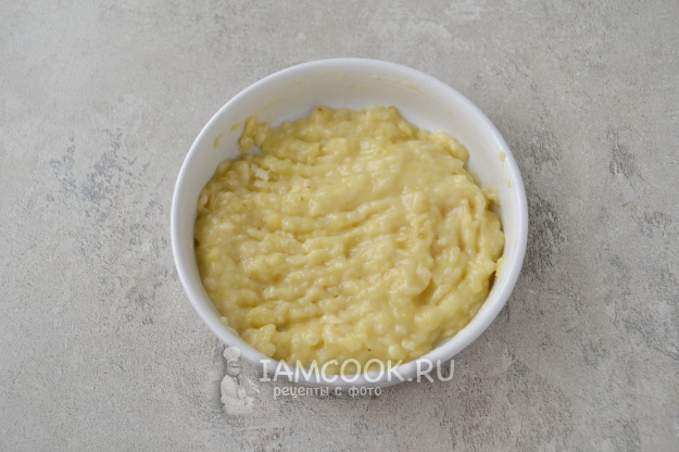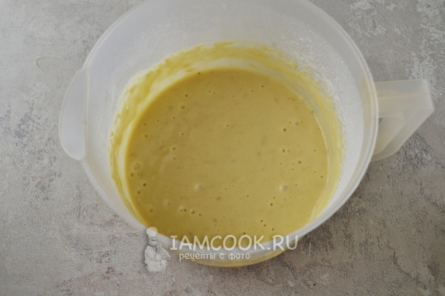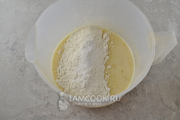Еще раз взбейте молочную смесь с банановым пюре и добавьте пшеничную муку с разрыхлителем.