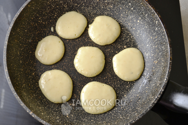 У мешка отрежьте кончик. На сухую хорошо разогретую сковороду отсадите маленькие порции теста.