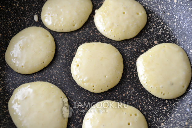 Обжаривайте мини-панкейки с бананом на умеренном огне. Когда на поверхности появятся пузырьки, панкейки пора переворачивать.