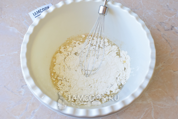 Постепенно всыпайте муку и аккуратно вмешивайте её в тесто.