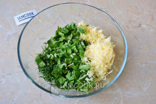 Пока тесто подходит, займитесь приготовлением начинки. Для этого нарежьте щавель и укроп. Добавьте тертый сыр. Все смешайте и немного подсолите.