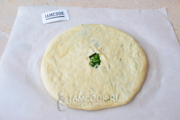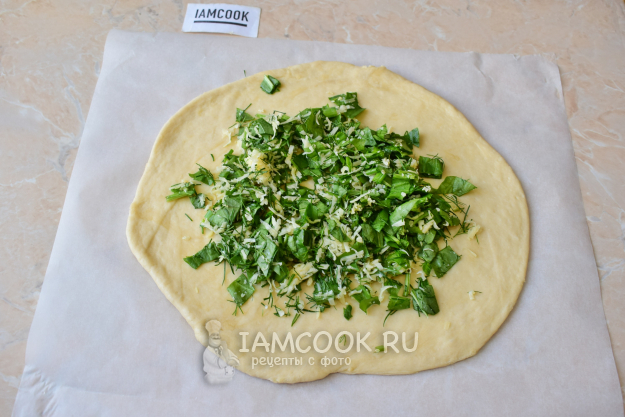 Когда тесто подойдет, извлеките его из чаши. Можно начинать готовить пирог. Раскатайте тесто на листе пергамента и выложите в центр подготовленную начинку, не доходя до краев.