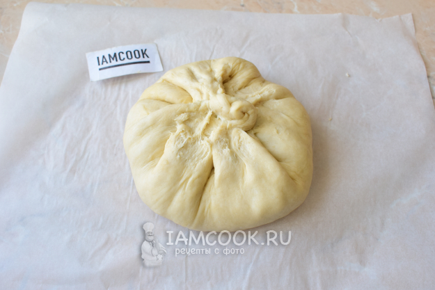 Края теста соберите в центре и немного прижмите, чтобы получилась лепешка.