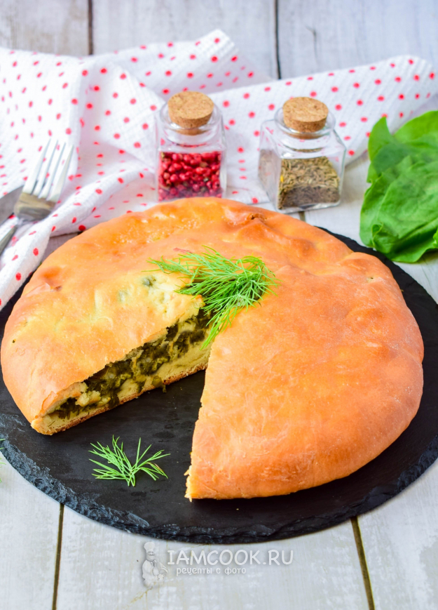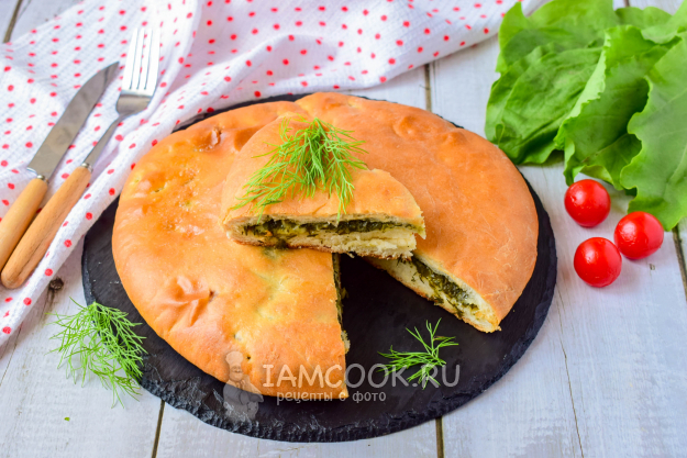 При выпекании пирог подрумянится. Извлеките осетинский пирог с щавелем и сыром из духовки. Сразу горячий пирог смажьте сливочным маслом, чтобы оно пропитало весь верх.