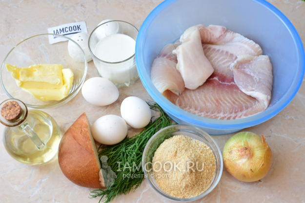 Для приготовления рыбных котлет по-киевски подготовьте необходимые ингредиенты по списку. Для таких котлет подойдет филе любой белой рыбы. У меня - филе пангасиуса.