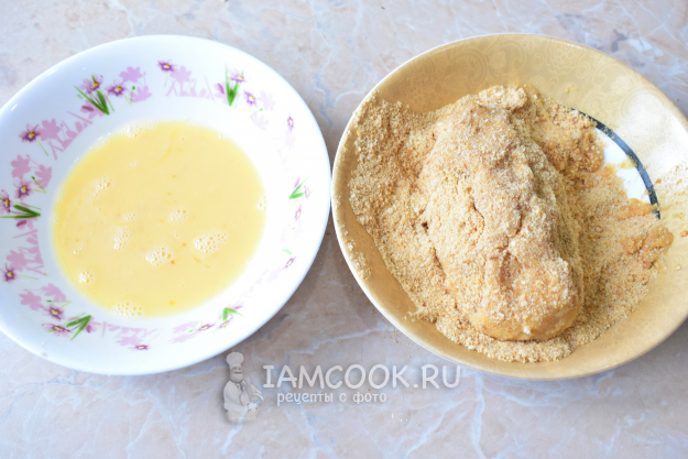 Обваляйте котлету в панировочных сухарях, затем окуните в яйцо и снова обваляйте в панировочных сухарях.