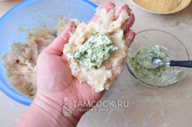 Из рыбной массы сделайте небольшую лепешку и в центр выложите немного начинки. Закройте начинку внутрь рыбной лепешки.