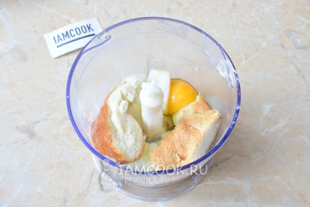 Так же измельчите батон, отжатый от молока, яйцо и луковицу.