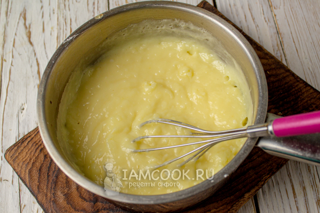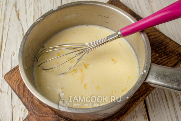 Затем ставим сотейник с молочно-яичной смесью на плиту и при среднем нагреве и постоянном помешивании доводим до кипения, варим пару минут, до загустения.