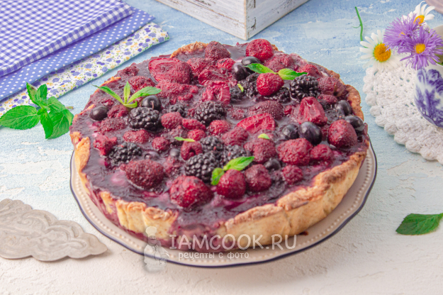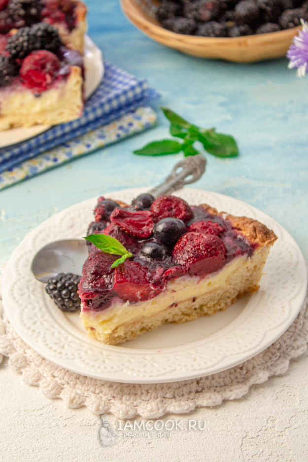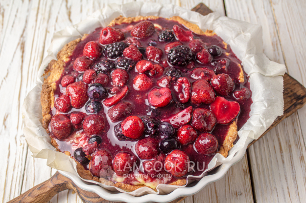 Тирольский пирог с ягодами и заварным кремом готов. Достаньте его из формы, удалите пергамент и переложите пирог на блюдо.