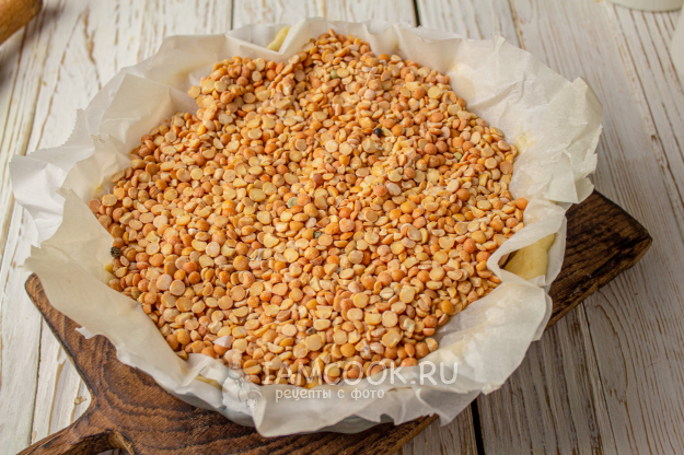 Поверх теста выложите лист пергамента и какой-либо груз, у меня - горох, который я постоянно использую для такого рода пирогов. Горох я не выбрасываю, складываю в чистую сухую банку и использую по назначению. Ставим форму с грузом в заранее разогретую до 190 градусов духовку на 10 минут.