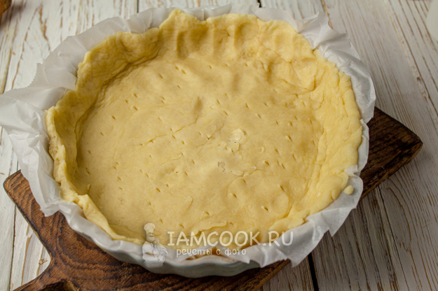 Вместе с пергаментом выложите тесто в форму, подровняйте его по высоте бортиков. Если есть лишнее, то срежьте. Сделайте проколы ножом или вилкой, чтобы оно в процессе выпечки не сильно вздувалось.