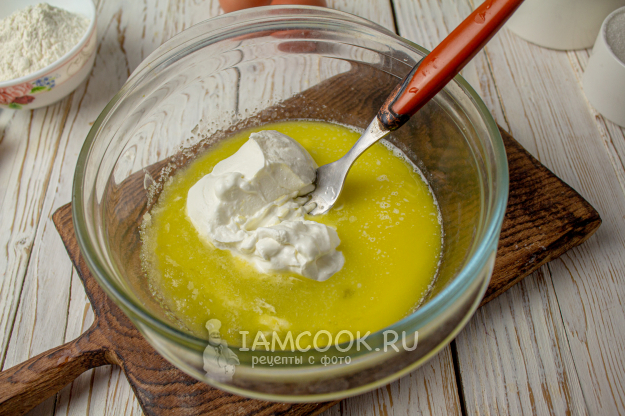 Начнем с приготовления основы - теста. В миске растопите сливочное масло или выложите его очень мягким, добавьте соль, сахар и сметану, перемешайте.