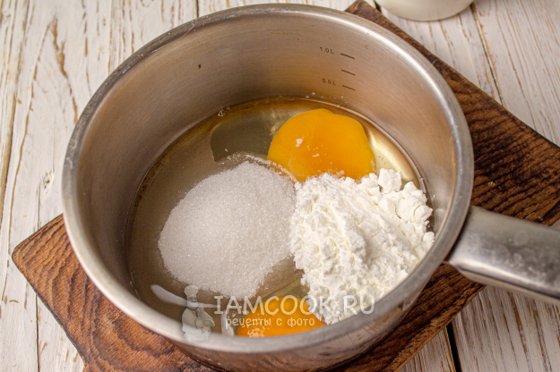 А пока основа остывает, приготовим заварной крем. Для этого в сотейник вбейте яйца, добавьте сахар и крахмал. Перемешайте венчиком. Вместо кукурузного крахмала можно добавить картофельный или использовать муку.
