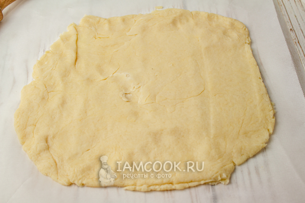 На листе пергамента раскатайте тесто в тонкий круг толщиной в 0,5-0,7 мм. Так как моя форма в диаметре - 22 см, то тесто раскатала почти 30 см, чтобы приподнять бока.