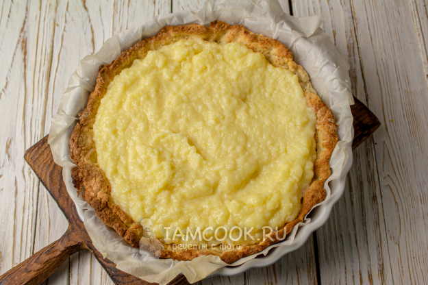На остывшую основу выложите заварной крем, уберите пирог в холодильник на 1-2 часа.