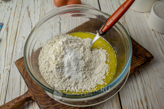 Добавьте просеянную муку, разрыхлитель.