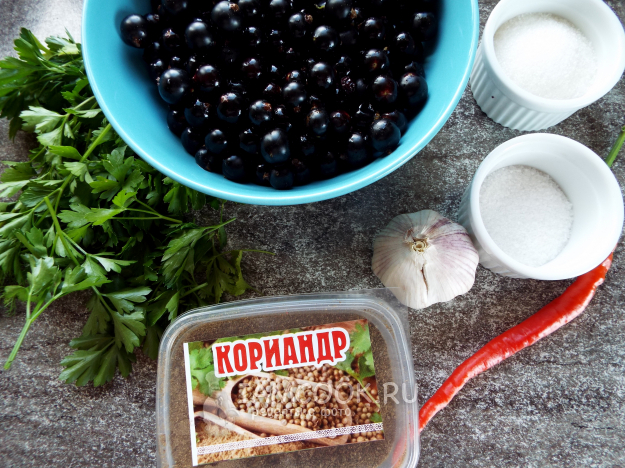 Для заготовки ткемали из черной смородины на зиму возьмите ягоды и остальные ингредиенты.
