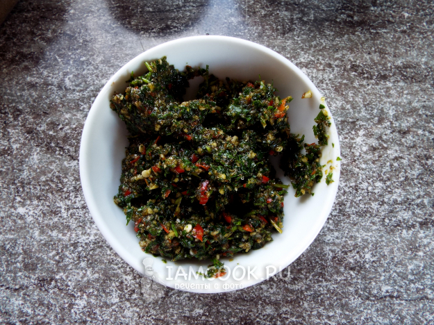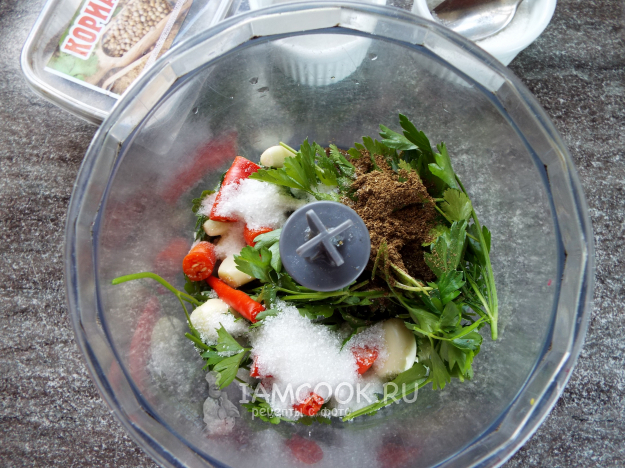 В чашу блендера сложить зелень, чеснок, чили перец, кориандр, соль и 1 ст.л. сахара.