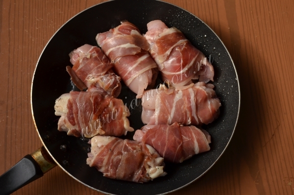 Свернуть курицу в рулет, обернуть ветчиной. Ветчину, при желании, можно заменить ломтиками бекона.