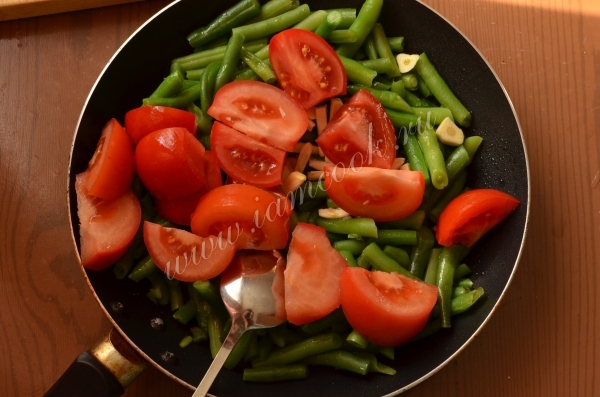 Добавить к фасоли помидоры с чесноком. Влить вино. Обжаривать еще 3-4 минуты.