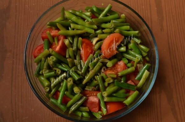 В сковороде разогреть оливковое масло, выложить туда фасоль, обжаривать 2-3 минуты.