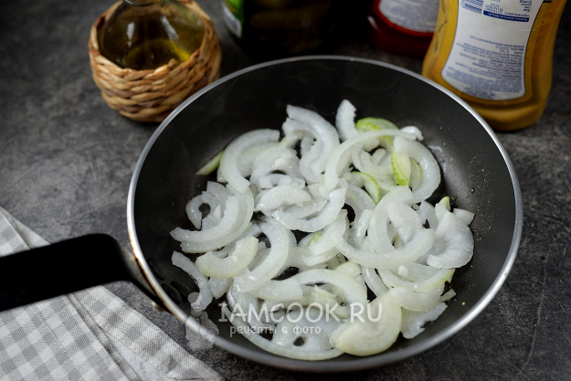 Первым делом разогрейте рафинированное постное масло, обжарьте на нем нарезанный полукольцами лук до золотистого цвета.
