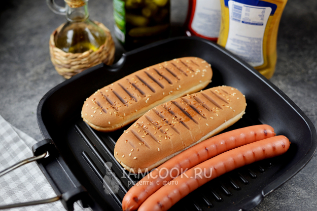 Разогрейте сухую сковороду гриль, обжарьте на ней сосиски и булочки до легких подпалин.