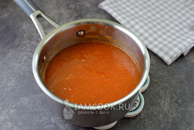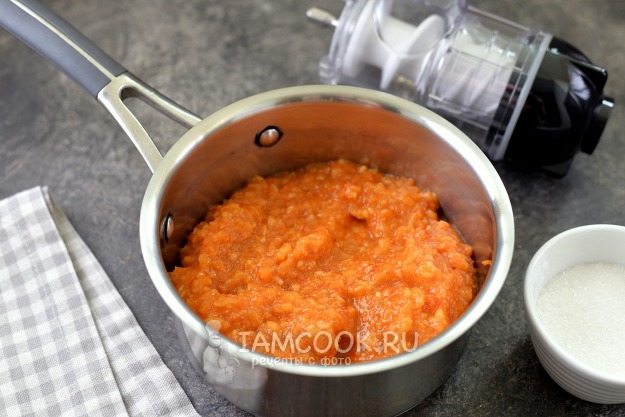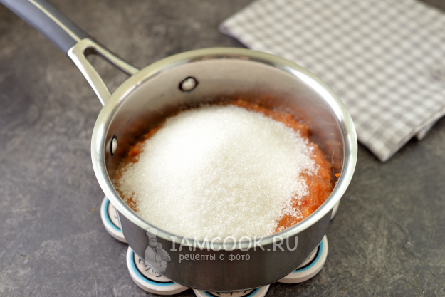 На кухонных весах отмерьте необходимое количество сахарного песка, аккуратно перемешайте абрикосовое пюре, поставьте на средний огонь на плиту.