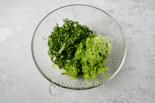 Петрушку вымойте и обсушите на полотенце. Мелко нарежьте и добавьте к измельченным стрелкам.
