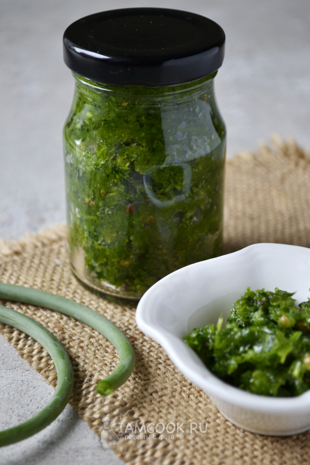 Немного аджики осталось на пробу. Аджика из чесночных стрелок получилась очень вкусной, острой, ароматной. Можно подавать к овощному салату, мясу, спагетти или просто намазать на кусочек хлеба.