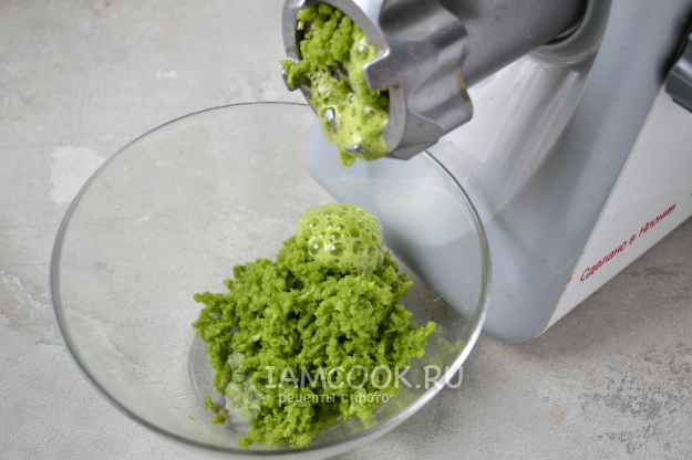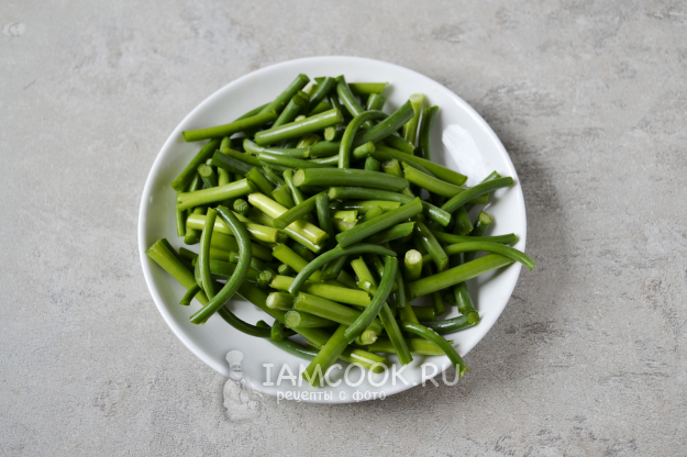 У чесночных стрелок отрежьте семенную коробочку, вымойте, нарежьте на небольшие кусочки, удобные для прокручивания в мясорубке.