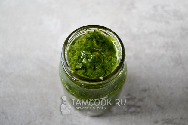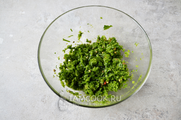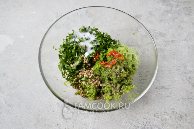 Перемешайте зеленую массу со специями и влейте растительное масло. Еще раз перемешайте. Аджика готова.