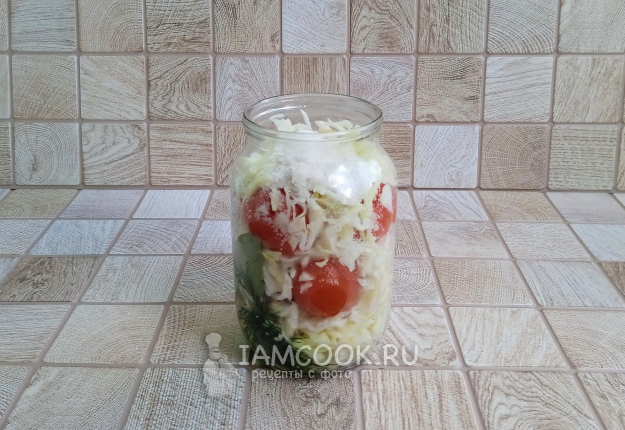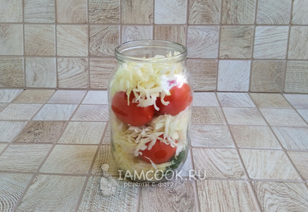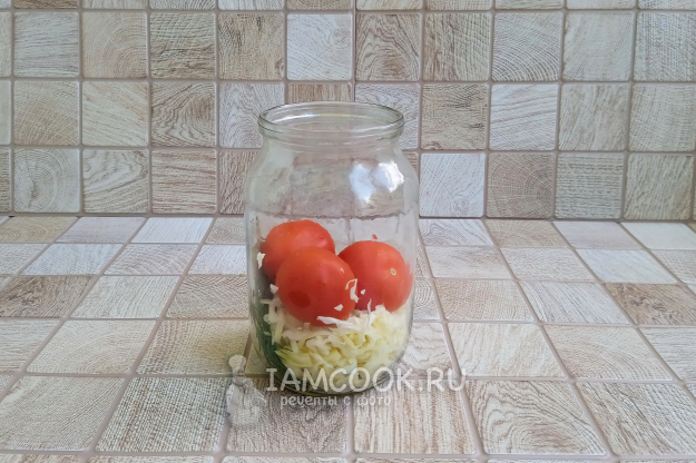 Капусту нарежьте соломкой, помидоры помойте. Выложите третью часть капусты и несколько помидоров в банку.