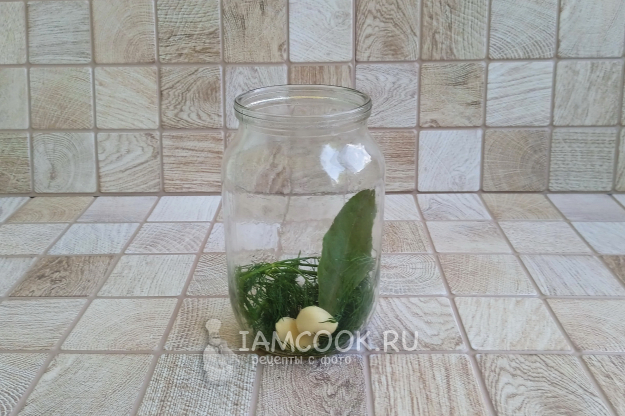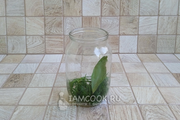 В стерилизованную банку выложите предварительно промытый укроп и лавровый лист.