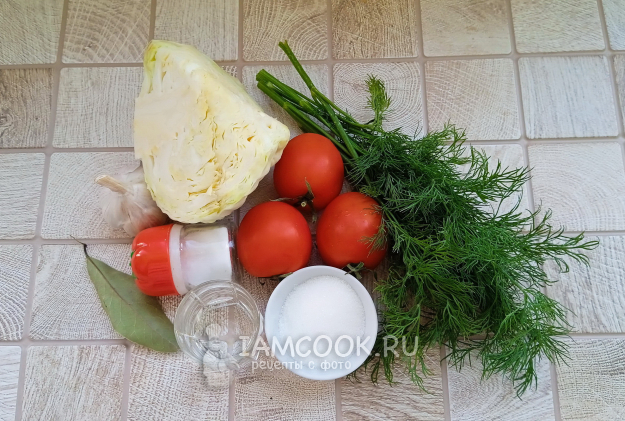 Для приготовления маринованной капусты с помидорами возьмите ингредиенты по предложенному списку.