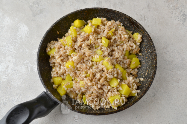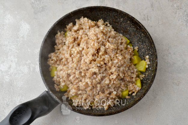 Добавьте полбу к обжаренной тыкве в сковороду.