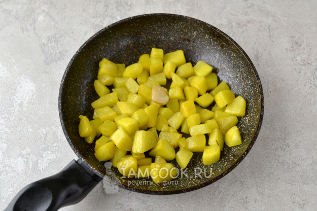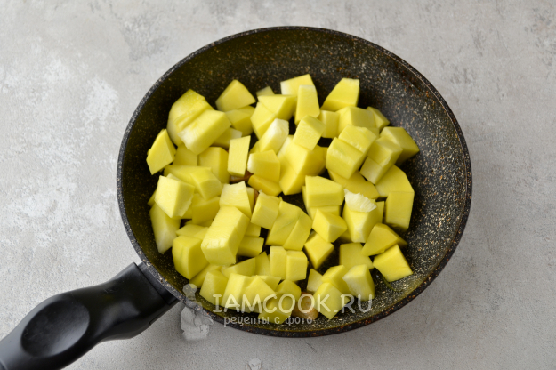 Добавьте в сковороду очищенную от кожуры и семян и нарезанную на кубики тыкву. Если чеснок очень поджаренный, удалите его со сковороды.
