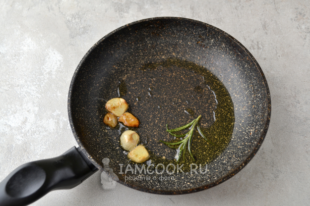 Пока полба варится, влейте в сковороду оливковое масло и слегка обжарьте нарезанный чеснок и веточку розмарина.