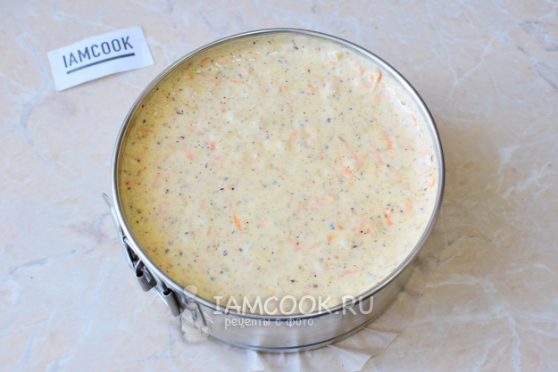 Готовое тесто получается средней густоты. Дно разъемной формы для выпечки (диаметром 18 см) застелите пергаментом. Переложите подготовленное тесто. Духовку разогрейте до 180 градусов. Поставьте тесто в духовку на 40-50 минут. При выпечке ориентируйтесь по своей духовке.