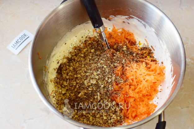 Выложите в тесто орехи, морковь, цедру и корицу. Смешайте все до однородной массы.