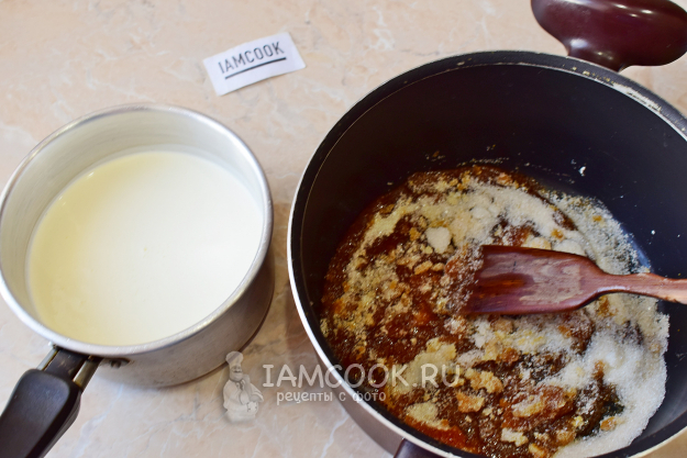 Для приготовления карамели возьмите посуду с толстым дном и растопите в ней сахар на очень маленьком огне. Не торопитесь делать большой огонь - сахар может подгореть. В растопленный сахар медленно вливайте сливки. Осторожно! Масса будет пузыриться.