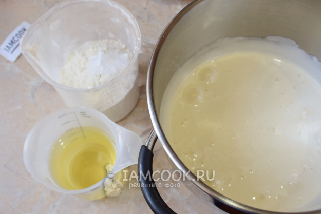 Яйца взбейте с сахаром в пышную светлую пену. Затем вмешайте растительное масло и муку с содой.