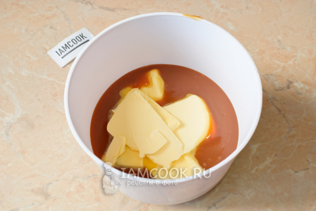 В горячую карамель нарежьте сливочное масло и полностью вмешайте его в массу. Готовую карамель перелейте в баночку, накройте и оставьте остывать.