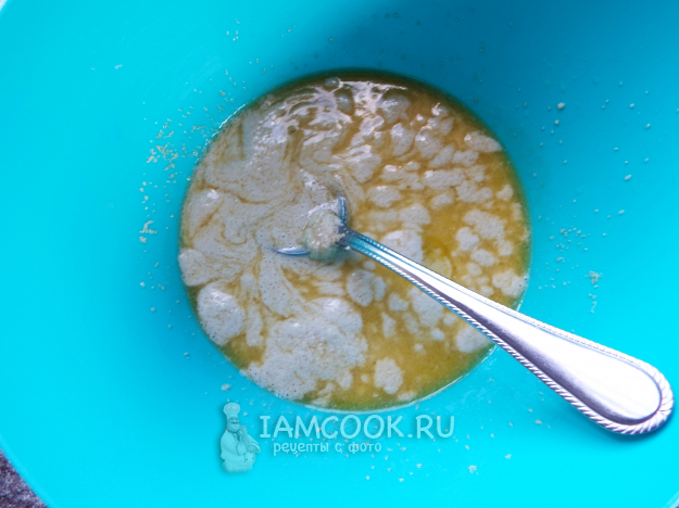В тёплый отвар добавить растопленное масло, дрожжи и сахар.