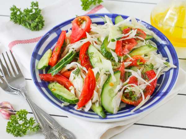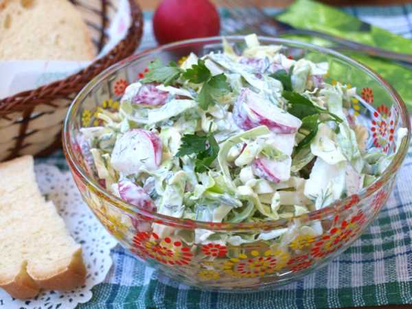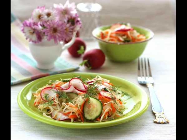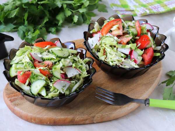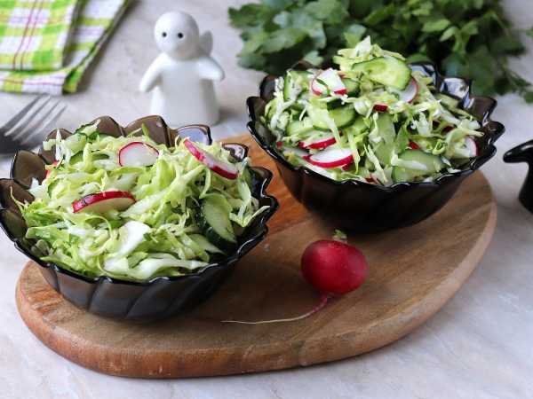 Салат с молодой капустой и редисом чрезвычайно популярен в конце весны и начале лета, когда на огороде ещё нет свежих овощей. В моей семье этот салат очень любят со сметаной. Пропорции салата конечно же условные. В него можно добавить и свежий огурчик и зелёный лук, а также петрушку. Пробуйте и экспериментитруйте!